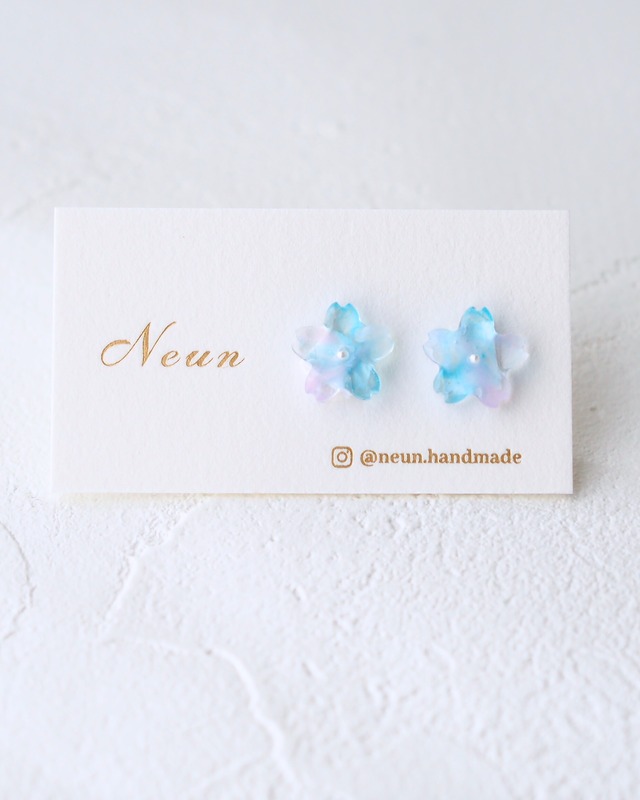 澄んだ青空に、ふわり春の風。 花びらと心をゆらしながら、新たな季節へ連れていく。 空色のような透明感ある水色に、淡く春の色をにじませた桜モチーフのイヤーアクセサリー。 透明感たっぷり、可憐に仕上げたデザインで、お花見や春のおでかけ、旅行にぴったりです。 レジン製のためとても軽く、1日中着けていても痛くなりにくい仕上がりです。 金具はイヤリング、樹脂ノンホールピアス、チタンピアス、樹脂ピアスの4種からお選びいただけます。 1点物ののためオーダーいただいてから金具を接着いたします。 透明度の高い作品のため、樹脂タイプがオススメです。 モチーフサイズ (cm):1.0 * 1.0 ぜひ着用画像をご参考にしてください。 レジン製の作品ですので強い衝撃を与えるとと傷・破損の原因になります。 また、保管の際は直射日光を避けた場所での保管をお願いいたします。 配送:クリックポストでのお届けになります(追跡番号あり)。 包装:商品オプションより通常包装 or ギフトボックスをお選びください。 ギフトボックスは下に緩衝材をつめ、台紙にはめた作品をのせ保護用の薄い紙をかぶせます。ボックスは高級感ある黒、リボンは作品に合わせた色でご用意いたします。 領収書・納品書等は同梱しておりません。 ご入用の際はお手数ですが注文時に備考欄にてお知らせください。