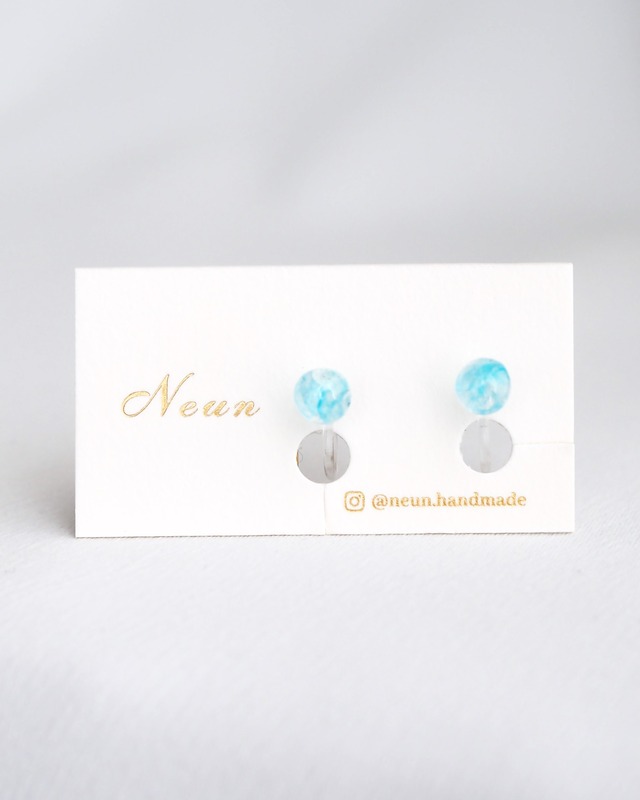 青と透明が小さな世界で出会う pebblue : pebble(小石)とblue(青)を組み合わせた造語 立体的な着色により、見る角度や光の当たり方で色合いや雰囲気が変わって見えるのが特長です。 石のような見た目ですが、レジン製のためとても軽くお使いいただけます。 樹脂ピアスでのご用意となります。 size (cm):直径 約8 mm 配送:通常10日以内に発送いたします。 詳細な発送日はショップトップでお知らせしております、ご確認ください。 クリックポストでのお届けになります(追跡番号あり)。 包装:商品オプションより通常包装 or ギフトボックスをお選びください。 ギフトボックスは下に緩衝材をつめ、台紙にはめた作品をのせ保護用の薄い紙をかぶせます。ボックスは高級感ある黒、リボンは作品に合わせた色でご用意いたします。 領収書・納品書等は同梱しておりません。 ご入用の際はお手数ですが注文時に備考欄にてお知らせください。