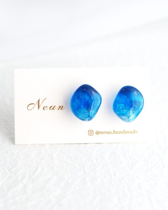 海辺(うみべ) 波打ち際、冷たく澄んだ風が通り過ぎたら 心のモヤも、涙も、どこか遠くへ連れて行ってくれないだろうか。 鉱石型、スタッドタイプのイヤーアクセサリーです。 正面から見ると花開くように、横から見ると鉱石が生えているように見えます。 青と透明のバランスにこだわり、立体的に色入れすることで 見る角度や光の当たり方で色合いや雰囲気が変わって見えるのが特長です。 石のような見た目ですが、レジン製のためとても軽くお使いいただけます。 樹脂ノンホールピアス(樹脂イヤリング)でも落とす心配はありません。 (耳たぶの薄い方にはネジバネ式イヤリングをオススメしております。) 金具:商品オプションよりネジバネ式イヤリング、樹脂ノンホールピアス、チタンピアス、樹脂ピアスのいずれかをお選びください。 一点もののためオーダーいただいてから金具を接着します。 レジンで作製しているためとても軽く、長時間着けていても不快感がありません。 size (cm):縦約1.5cm、ぜひ着用画像をご参考ください 配送:通常10日以内に発送いたします。 詳細な発送日はショップトップでお知らせしております、ご確認ください。 クリックポストでのお届けになります(追跡番号あり)。 包装:商品オプションより通常包装 or ギフトボックスをお選びください。 ギフトボックスは下に緩衝材をつめ、台紙にはめた作品をのせ保護用の薄い紙をかぶせます。ボックスは高級感ある黒、リボンは作品に合わせた色でご用意いたします。 領収書・納品書等は同梱しておりません。 ご入用の際はお手数ですが注文時に備考欄にてお知らせください。