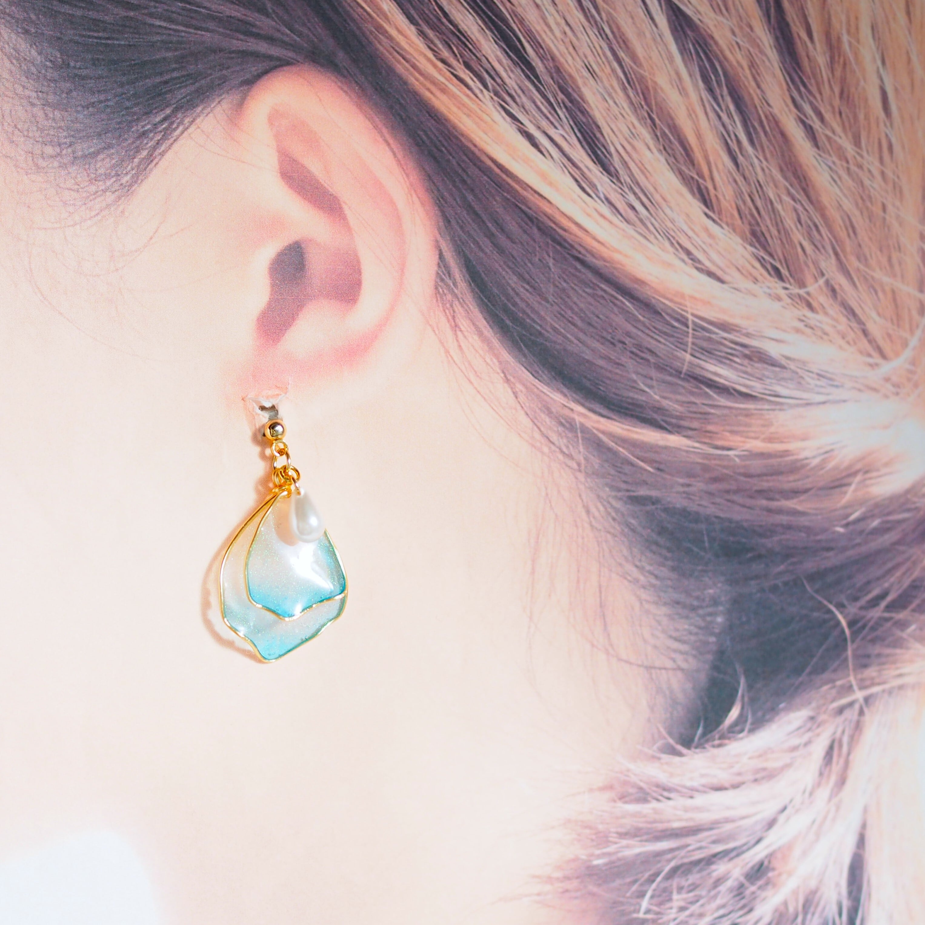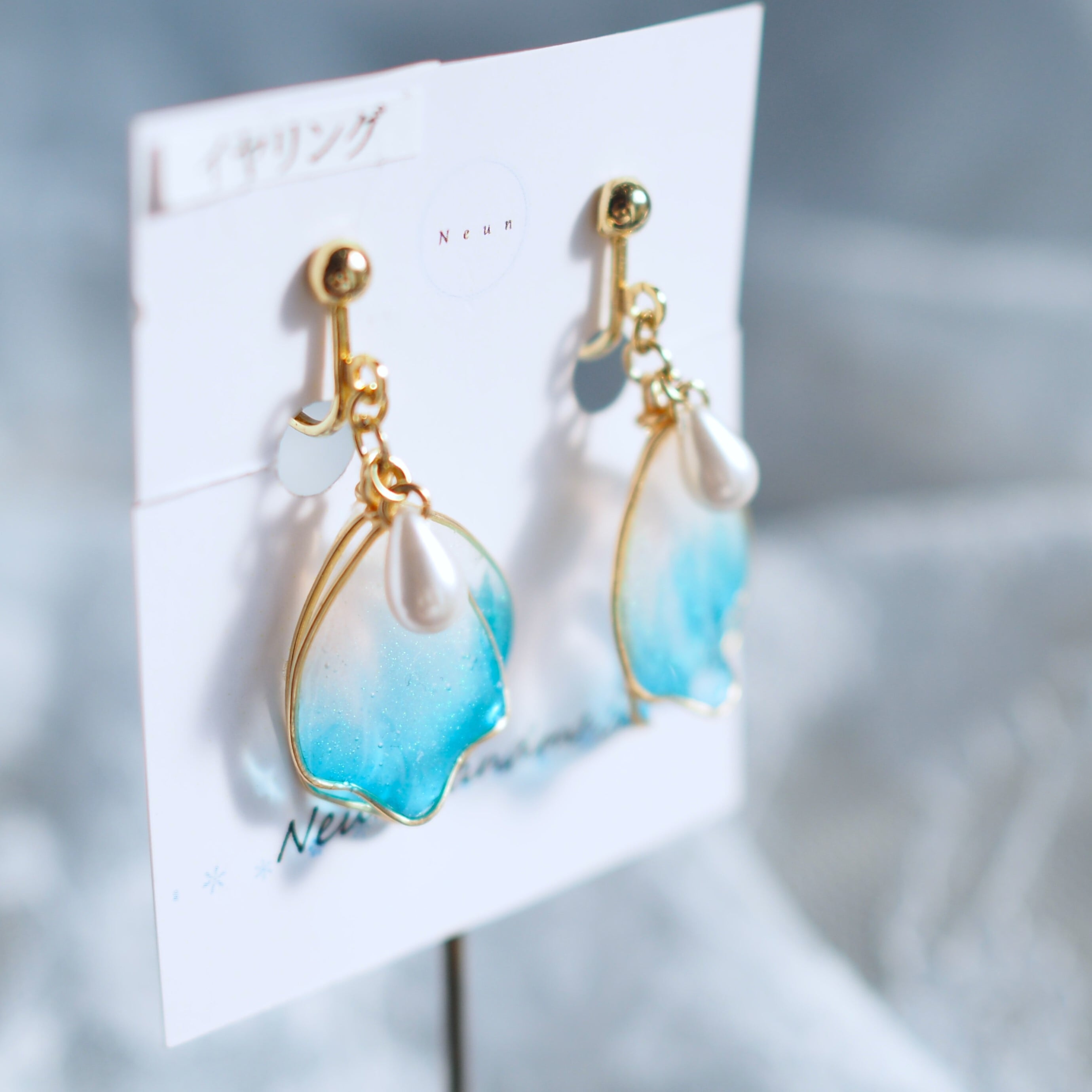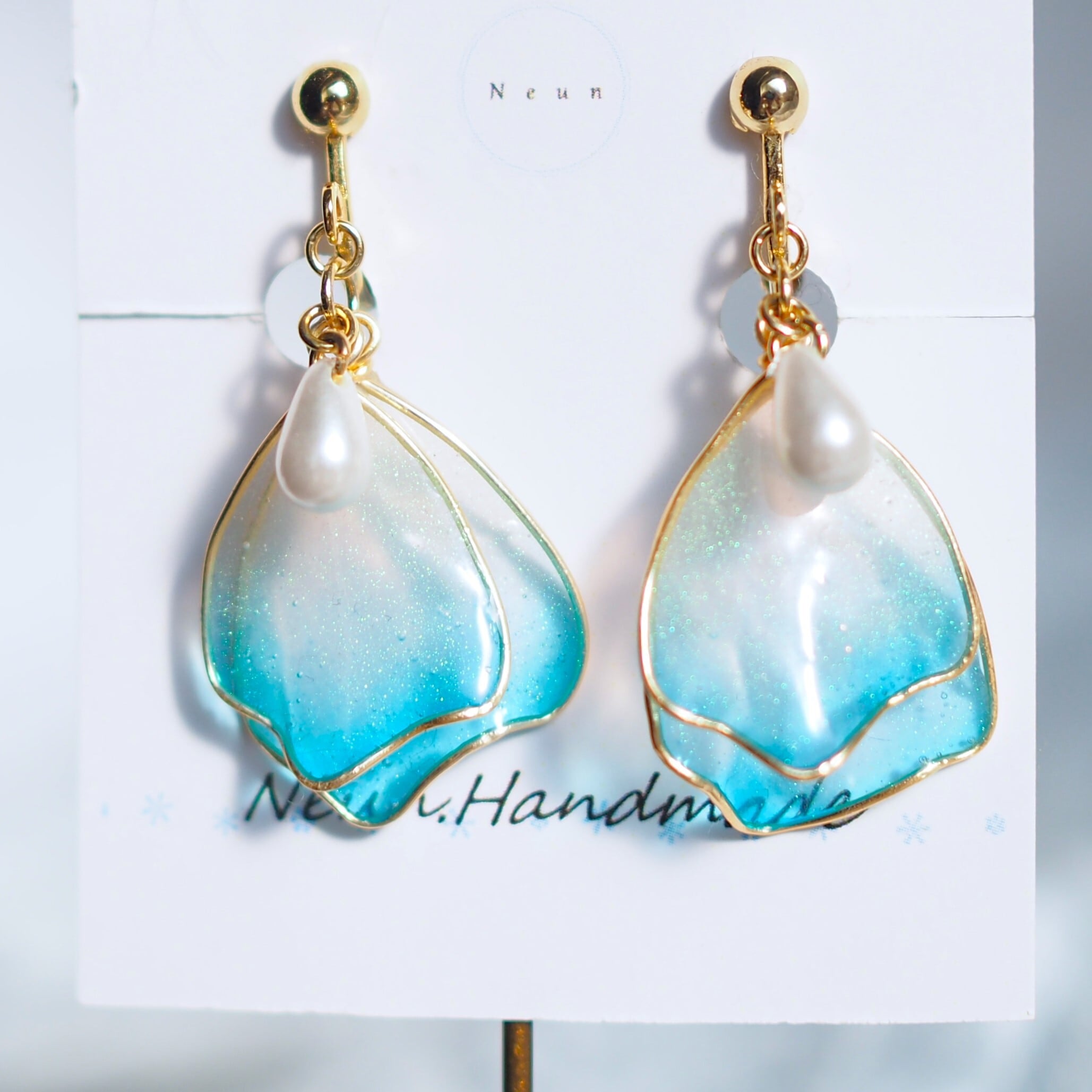 海のように波打つ、水色のグラデーションが美しい花びらのイヤリングです。