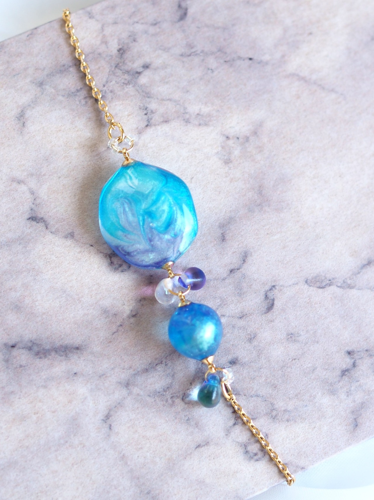青紫のチェコビーズと組み合わせることできらめきを増しました。絶妙な色合いのレジンとビーズのバランスが大変美しいです