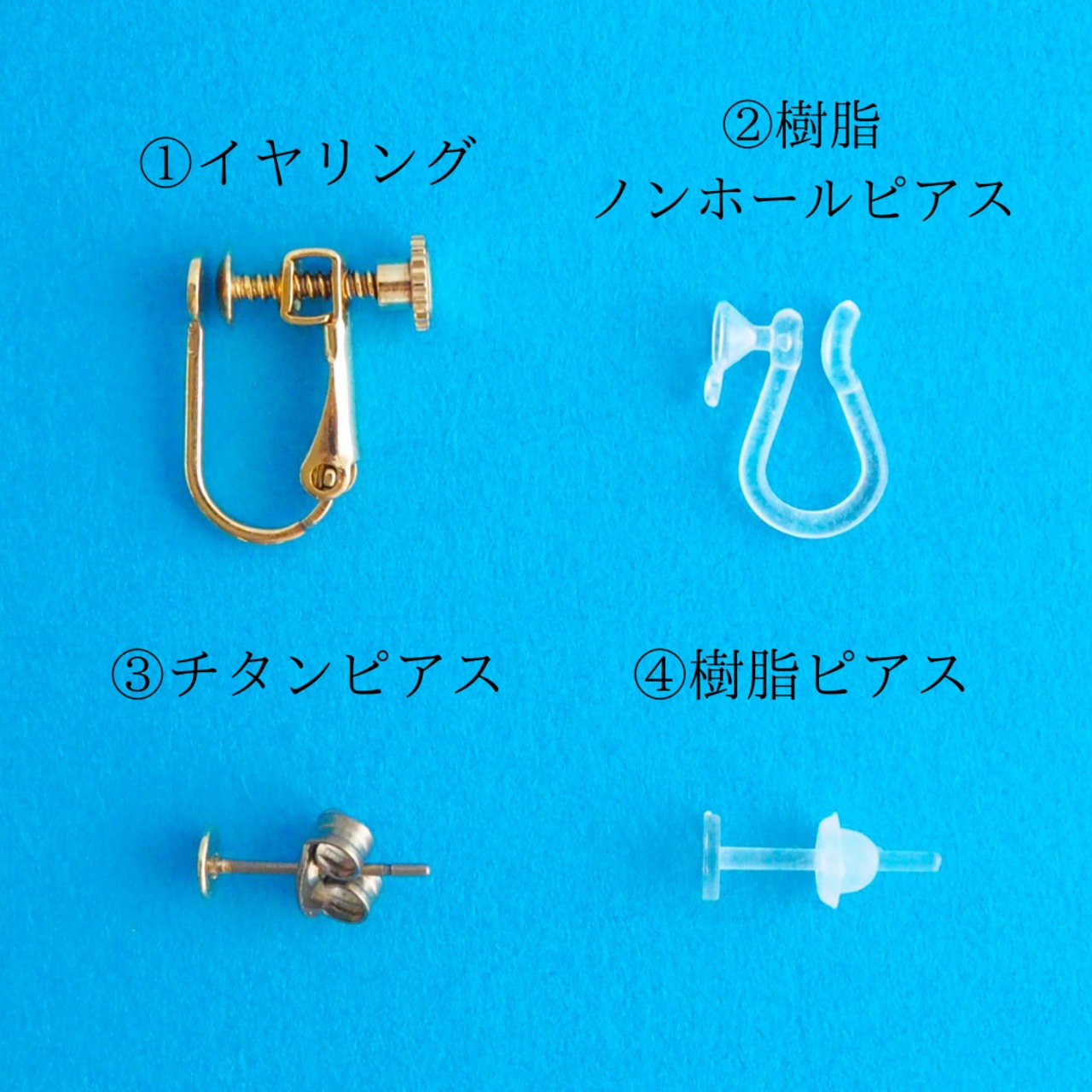 金具:商品オプションよりネジバネ式イヤリング、樹脂ノンホールピアス、チタンピアス、樹脂ピアスのいずれかをお選びください。
