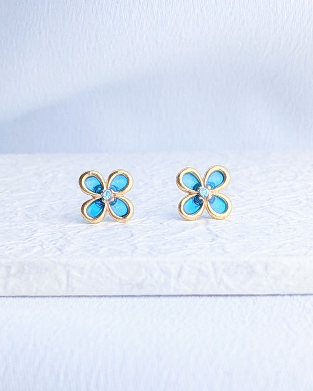 四つ葉のイヤリング 水色[イヤリング / スタッド /Simple Stud ] 花 青 水色 空 四葉 クローバー 小さい 上品 ゴールド 控えめ シンプル 透明 クリア 冬 春 レジン 揺れない スタッド